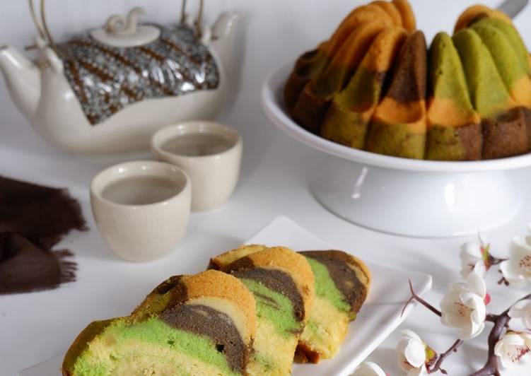 - Bagi 3 adonan sama rata, satu bagian beri pasta pandan, satu bagian beri coklat bubuk dan bagian lainnya polos. Siapkan loyang, masukkan adonan selangseling sesuai selera. Putar adonan memakai sumplit agar terbentuk motif marmer..